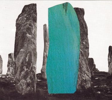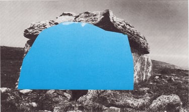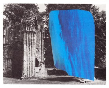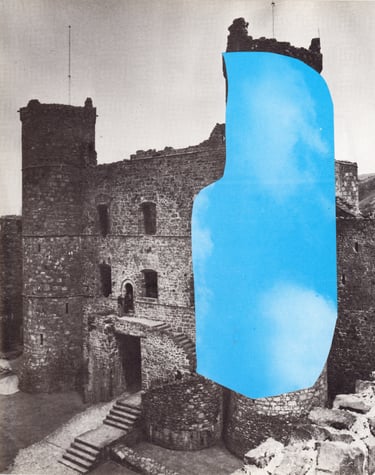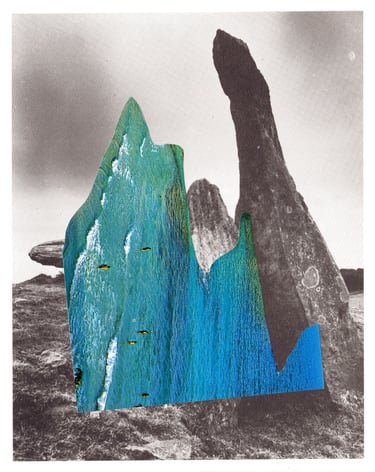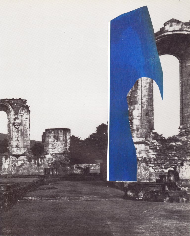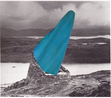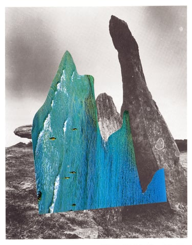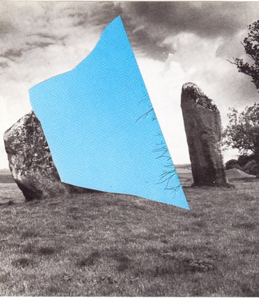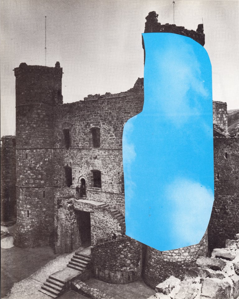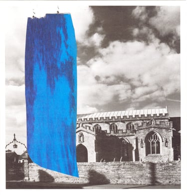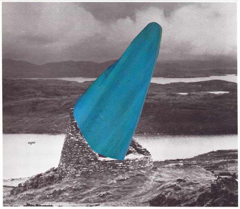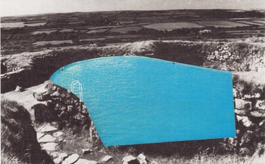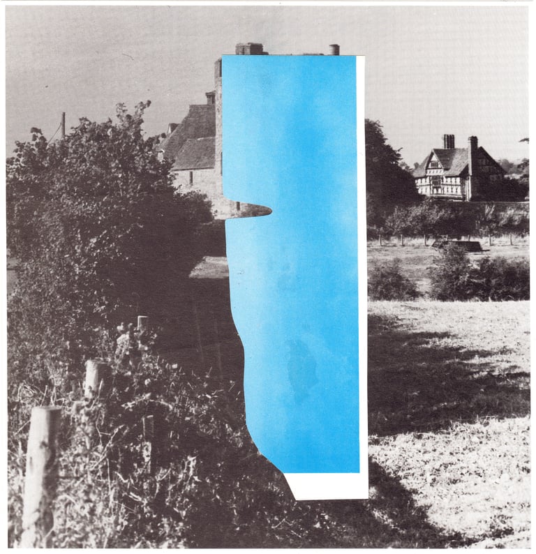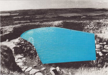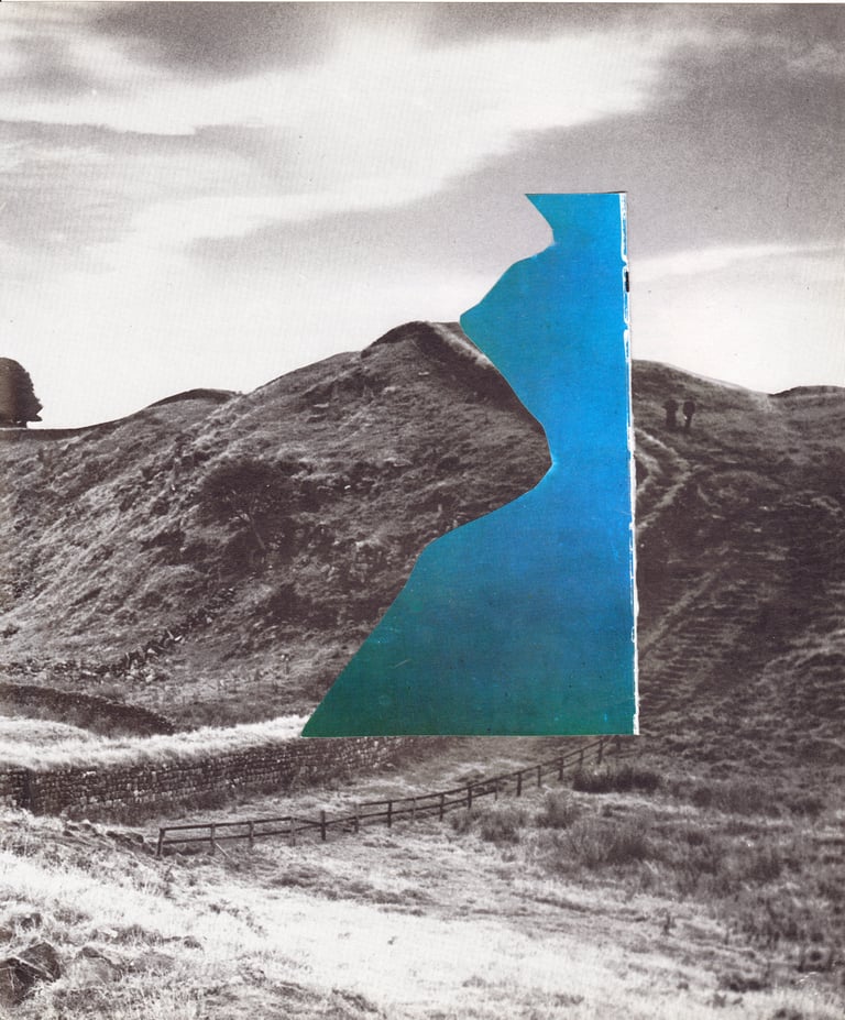 The grey landscapes of the UK layered with the blue-green sea and sky of Spanish holiday resorts.